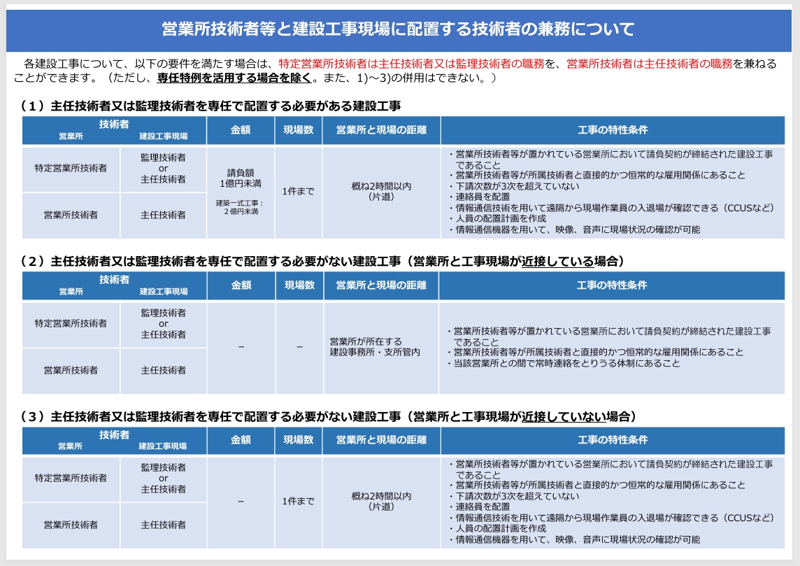 2026年現在、専任技術者が現場の主任技術者・監理技術者を兼ねるための要件は、「金額」と「営業所からの距離」によって以下の3パターンに分かれます。